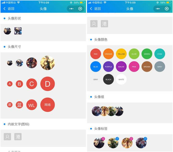 比如,打開「頭像」,就會看到被一一列舉的圓形頭像、圓角矩形頭像、各種尺寸頭像、默認(rèn)頭像、文字頭像、彩色頭像、頭像組、貼標(biāo)簽頭像等等。一個這么簡單的組件,也可以有許多種不同的呈現(xiàn)方式。
