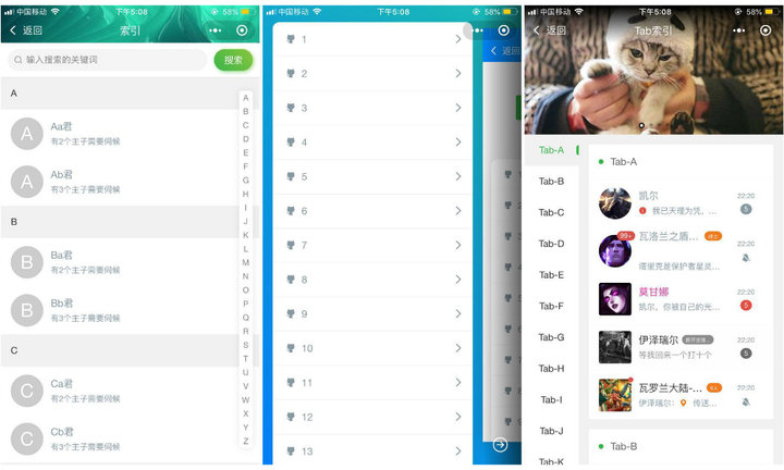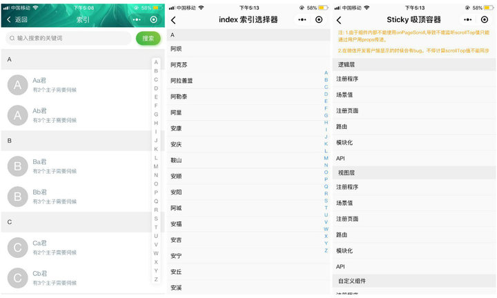 其中,「索引選擇器」與 ColorUI 中的「索引列表」是同類組件,不同的是,ColorUI 的「索引列表」中每一項可以包含圖片、名字與描述,且支持搜索,而 iViewUI 的「索引選擇器」中每一項只包含名字,且不支持搜索。