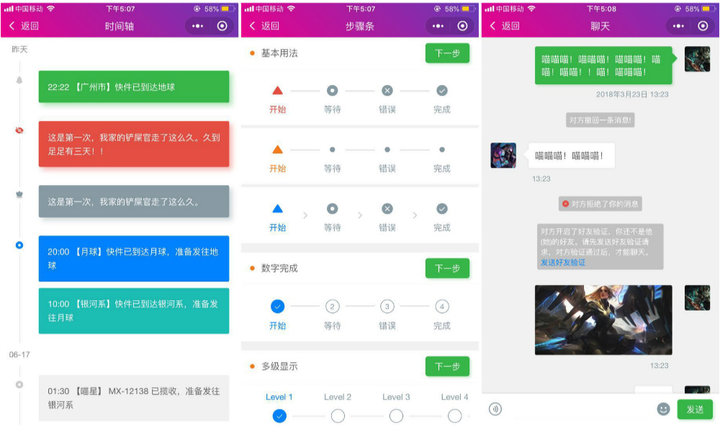 ColorUI 是由文曉港發(fā)布的高顏值組件庫,側(cè)重于視覺交互。比起 WeUI 的低調(diào)克制,ColorUI 色彩鮮亮,樣式繁多。除了擁有非常豐富的原生組件的自定義樣式,它還提供一些常見的頁面元素,比如時間軸、步驟條、聊天頁、模態(tài)窗口等等。