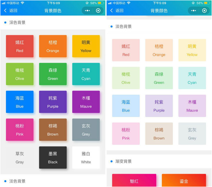 前面我們已經(jīng)提到,ColorUI 是側(cè)重于視覺交互的組件庫,這方面的表現(xiàn),還在于它為用戶提供了色彩的搭配方案。打開「背景」,可以看到深色、淡色、漸變等多種配色。