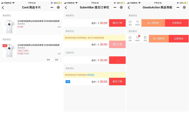 首先,我們來看「業(yè)務(wù)組件」這一塊??梢钥吹?,「商品卡片」與「提交訂單欄」兩個組件可以構(gòu)成一個基本的「購物車」頁面;而「商品卡片」與「商品導(dǎo)航」二者又可以組成一個簡單的商店頁面。
