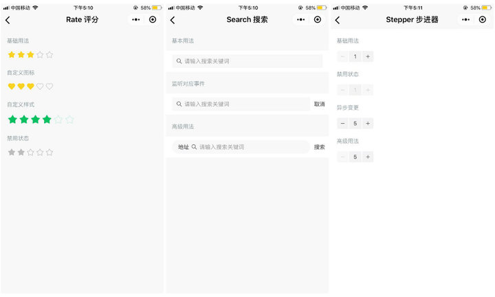 我們再看看其他瑣碎的組件,比如「表單組件」中的「評分」、「搜索」、「步進(jìn)器」,都屬于購物類小程序需要用到的組件。