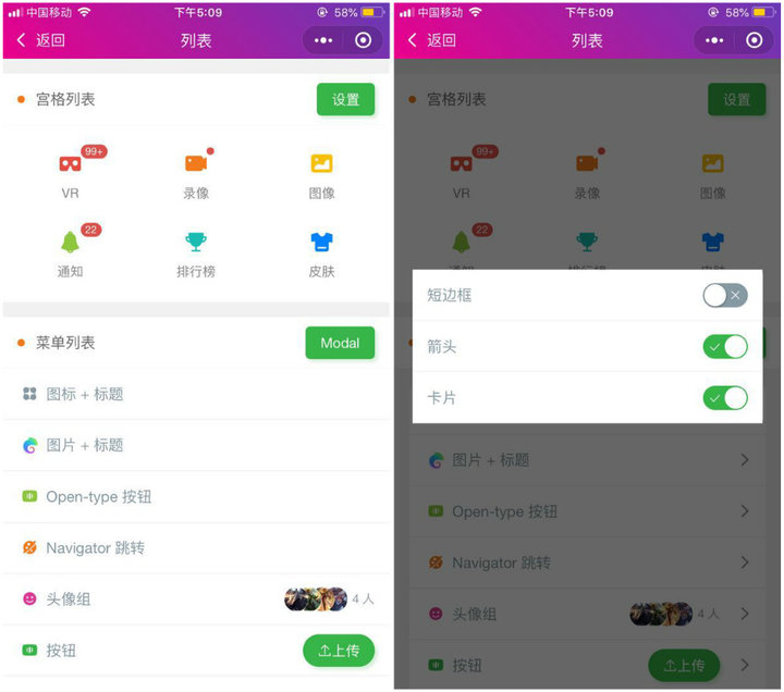 又比如,打開「列表」,不僅可以看到宮格列表、菜單列表、消息列表、左滑列表等基本的樣式,還可以設(shè)置一些可選項,像邊框、箭頭等,在細(xì)節(jié)處也有多種可選樣式。