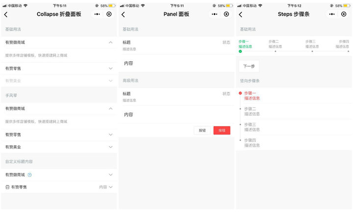 「展示組件」中的「折疊面板」與「面板」可以用作詳細(xì)介紹商品的組件,「步驟條」則可以用于顯示物流跟蹤信息。