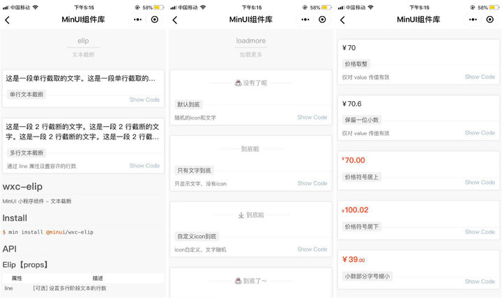 調(diào)用「基礎(chǔ)元件」中的「文本截斷」,可以控制長文本的顯示行數(shù),文本超長的用省略號結(jié)尾?!疙摰滋崾尽箍梢杂迷谏侠虞d中的過程中。而「價格」則提供了各種樣式的價格及貨幣符號。