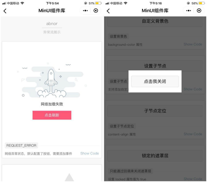 「功能組件」的「異常流展示」為開發(fā)者提供了各種異常狀態(tài)下,向用戶展示的界面?!刚谡謱印箘t提供了各種效果的遮罩層,及其顯示、隱藏方式。